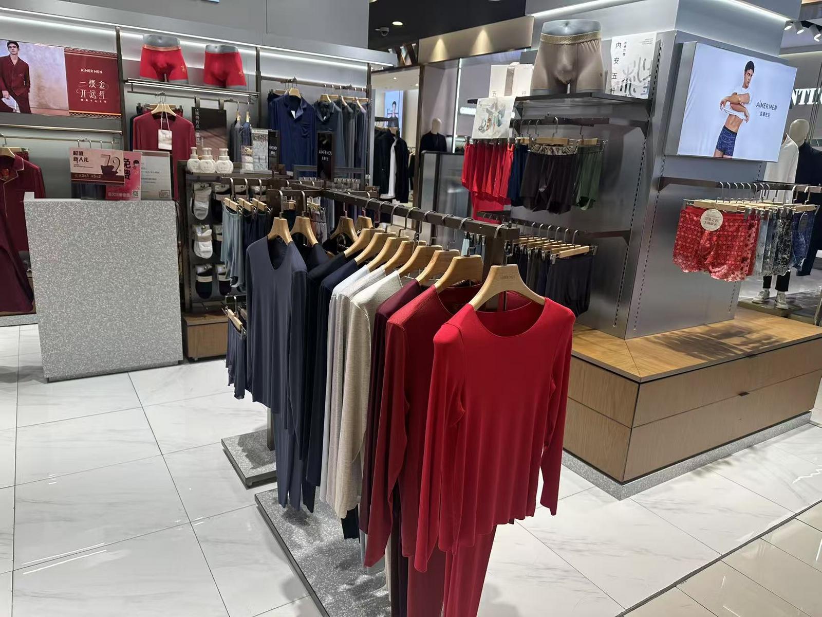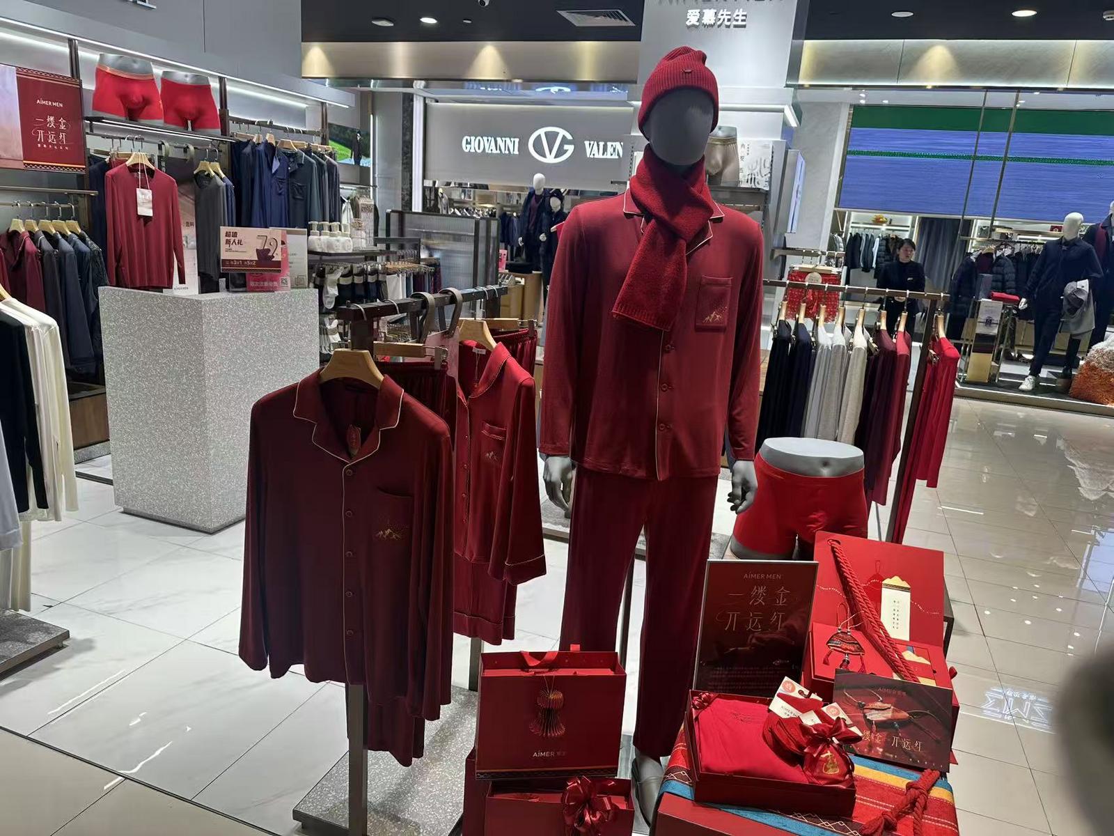 在杭州的各大商场里,不少内衣内裤专柜也把红色系摆在了醒目位置,在武林银泰C馆2楼的爱慕先生门店,假人模特比市民更早地穿上了今冬新款家居服。另一排货架上,不同类型的红色保暖内衣被放在了最外侧显眼的位置。